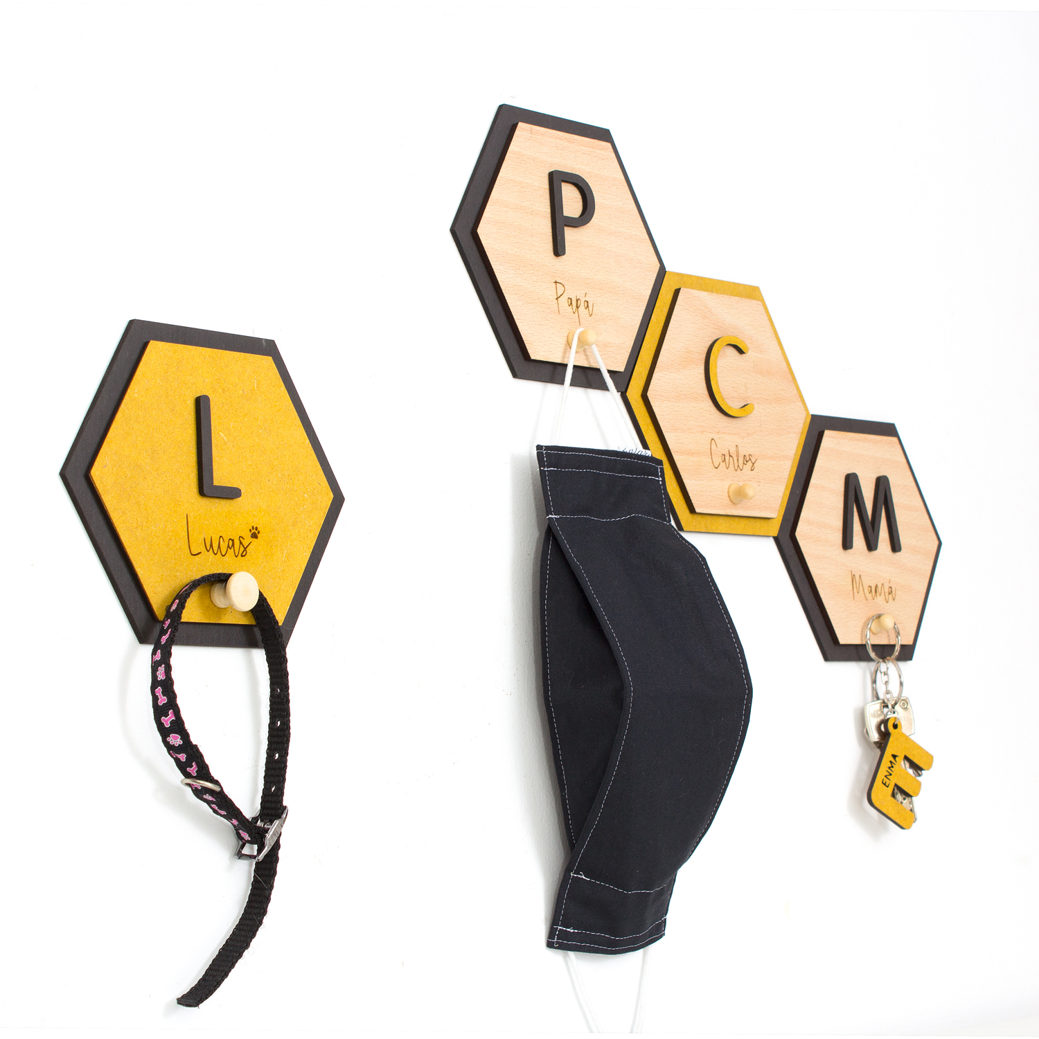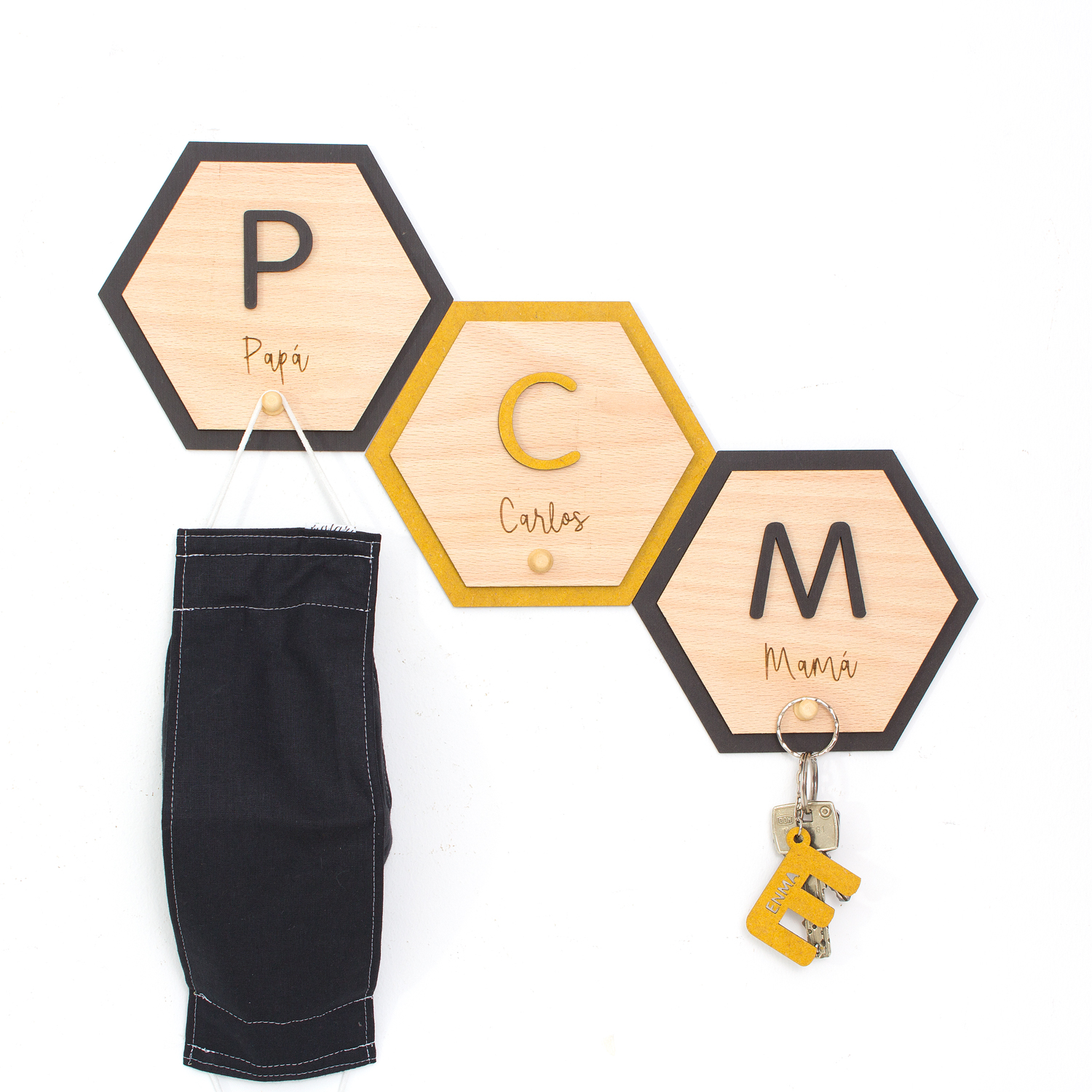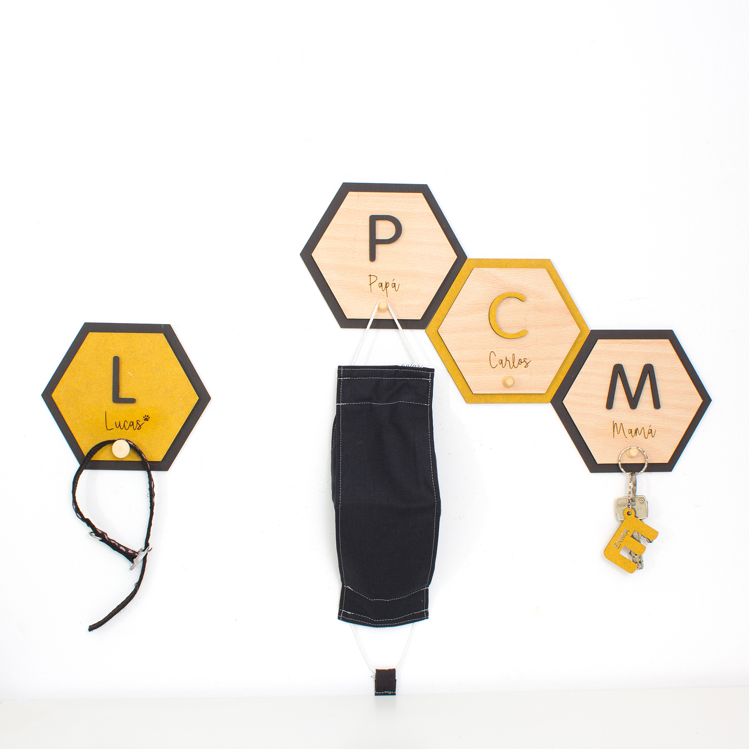 Si vives con más personas, seguro que has tenido problemas a la hora de dejar o guardar la mascarilla en algún rincón de casa, de no saber que llaves son de cada uno…con este colgador, con el nombre de cada miembro de la casa, conseguirás poner un poquito de orden.