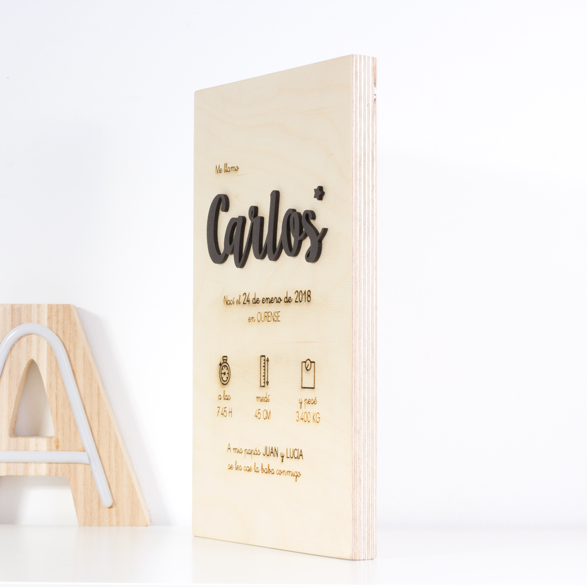 Natalicios de madera infantiles personalizados con todos los detalles del día que llegó al mundo ese bebé tan esperado: el nombre, la fecha, el lugar, la hora, el peso, la altura…mil y un detalles que quedarán grabados para siempre.