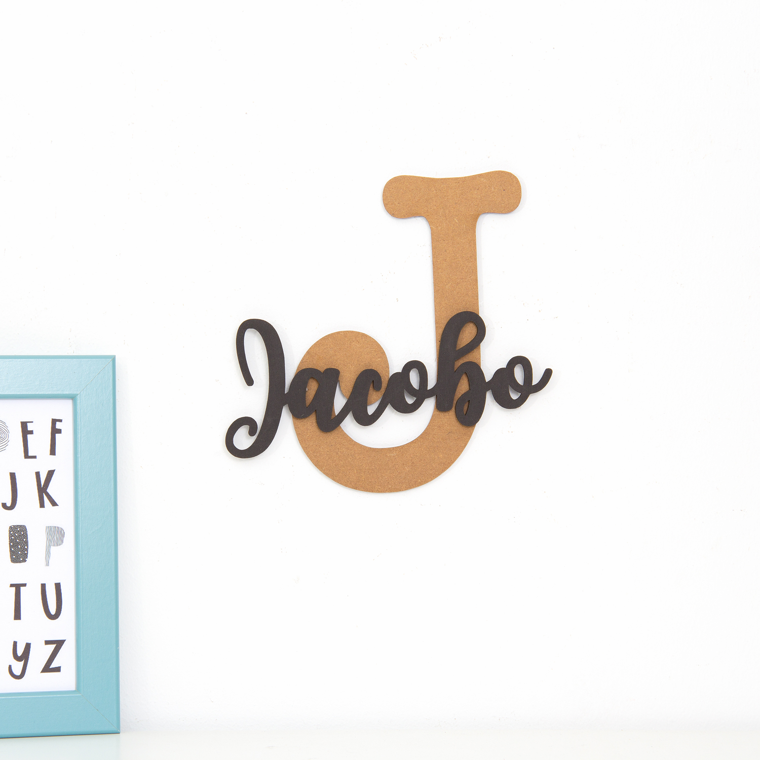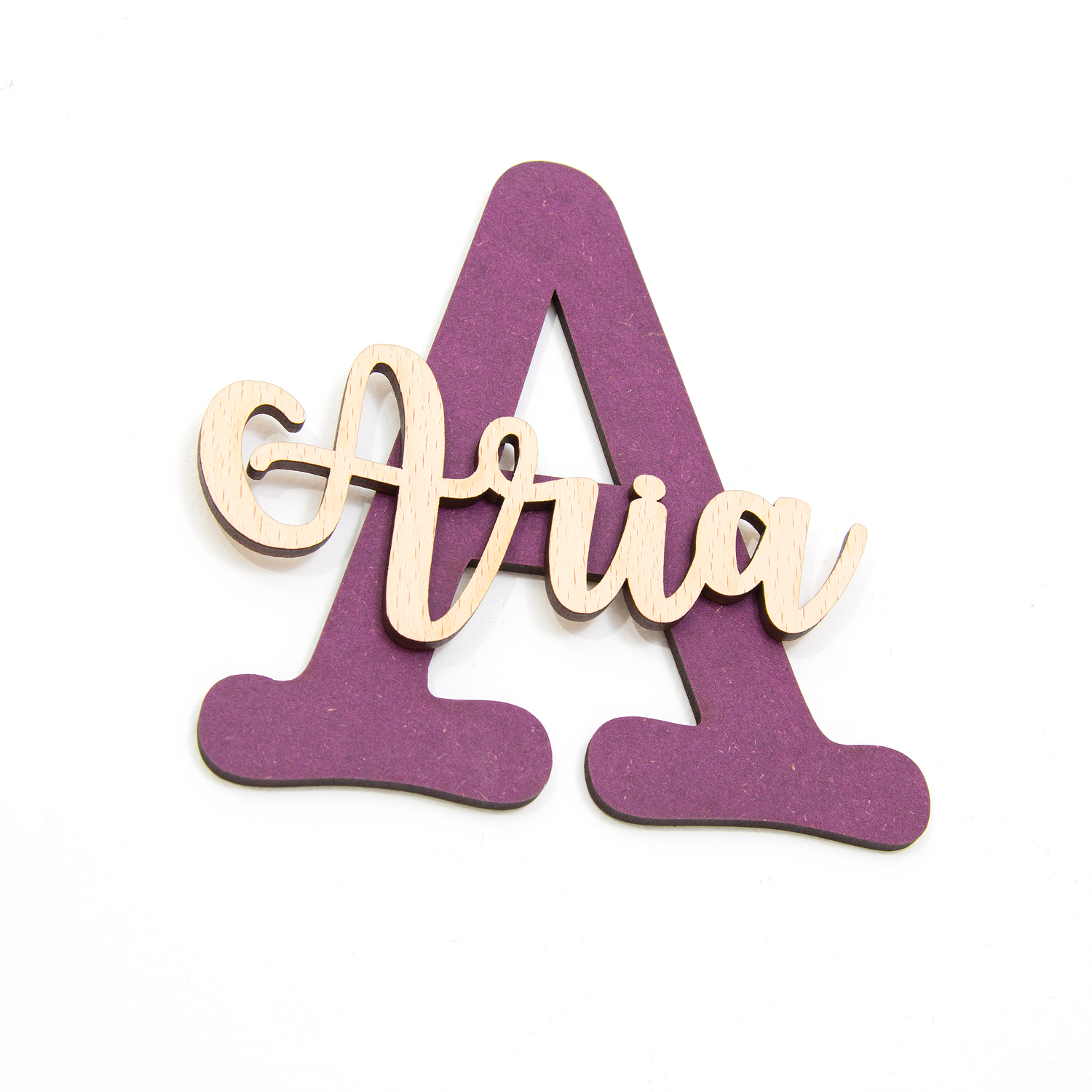 Placa de madera con la letra inicial y el nombre completo pegado sobre ella, para decorar las paredes de la habitación, la puerta, la cuna o el armario de los más peques de la casa.