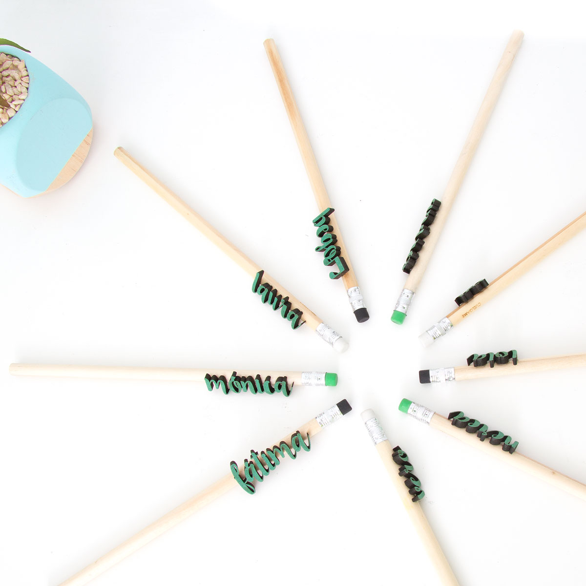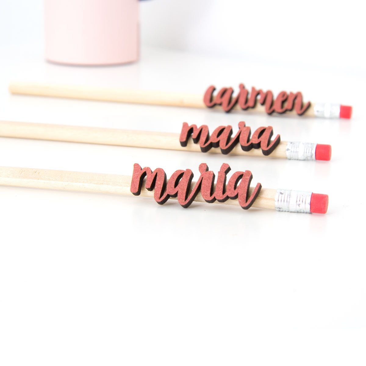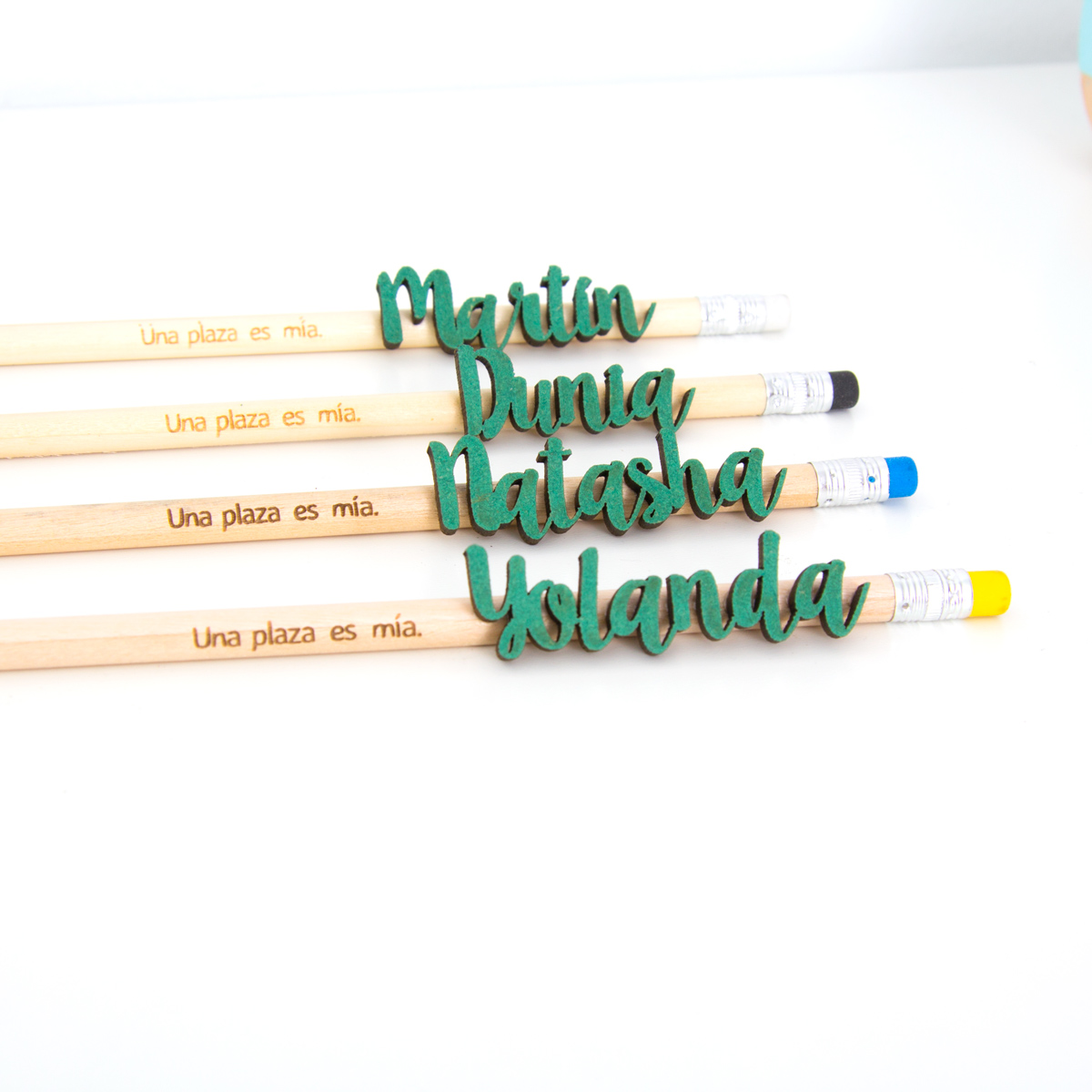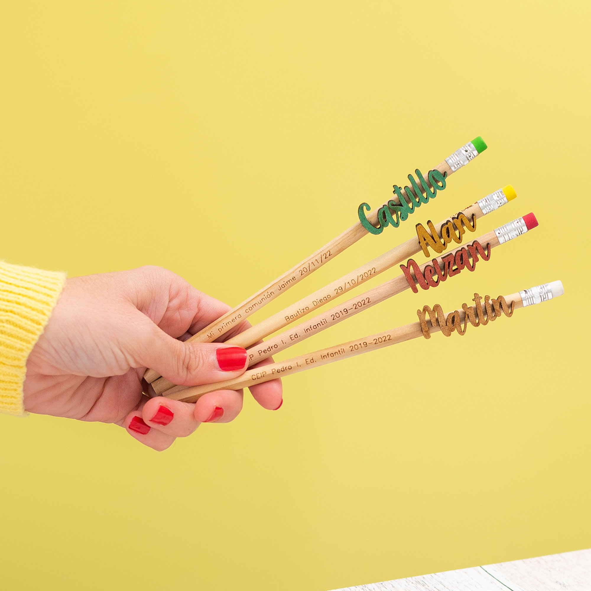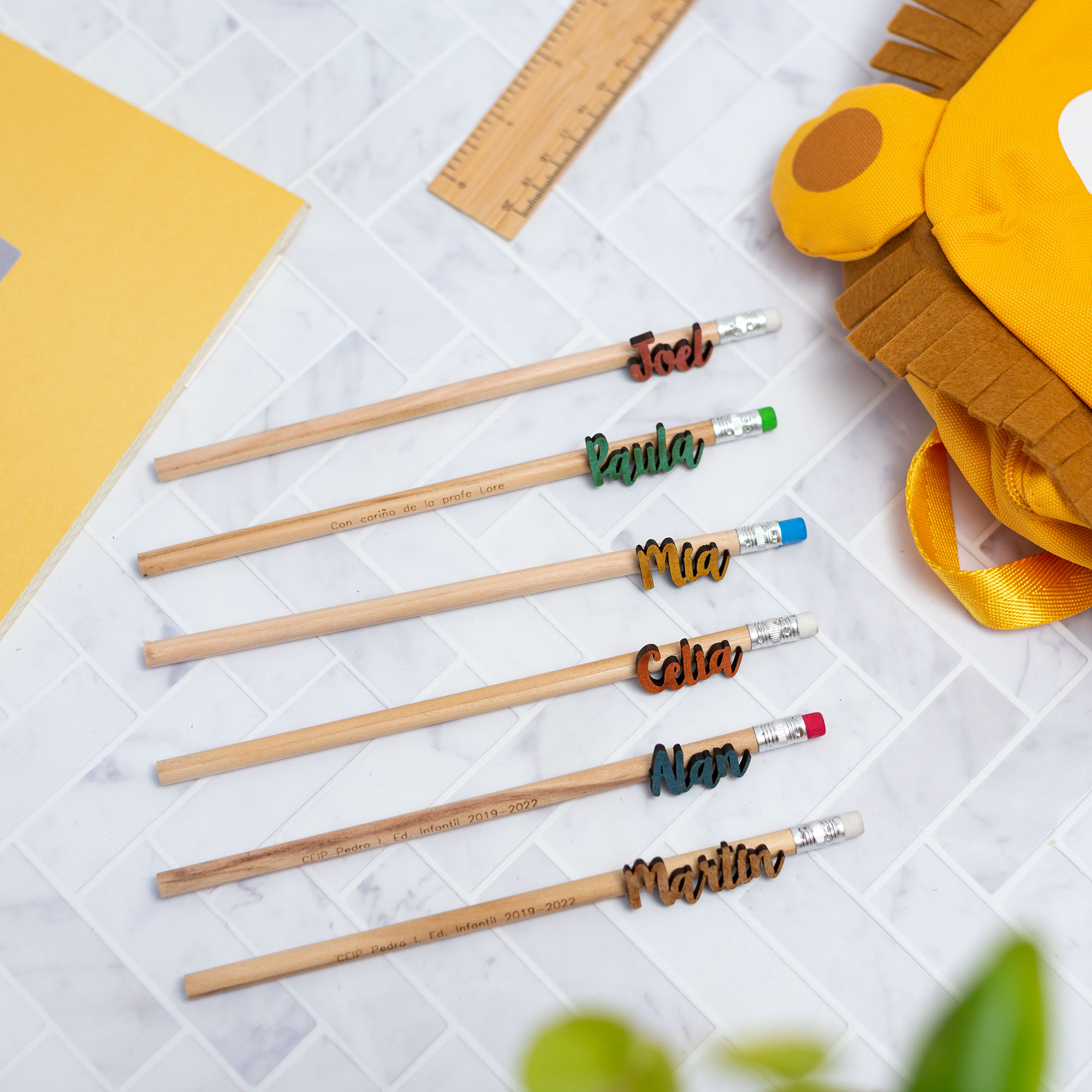 Los lápices tradicionales personalizados con tu propio nombre, con casquillo de gomas de colores, como los de toda la vida…