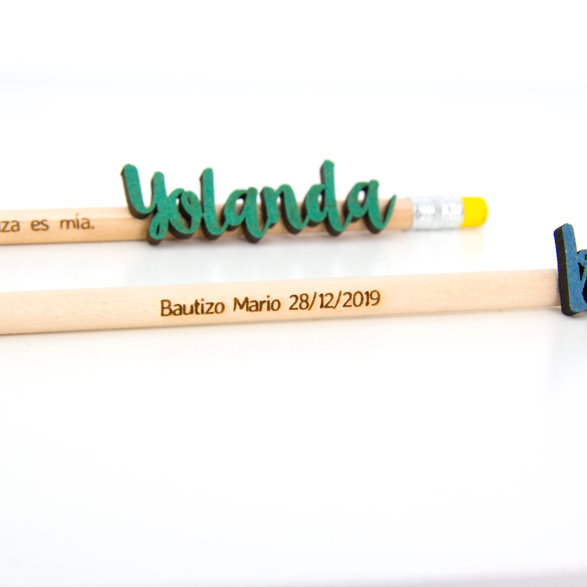 Nota: al tratarse de lápices de madera natural puede presentar vetas o tonalidades ligeramente distintas a las que muestra la imagen. Igual que el grabado, que puede variar su profundidad y color en función del veteado de la madera en ese punto concreto.