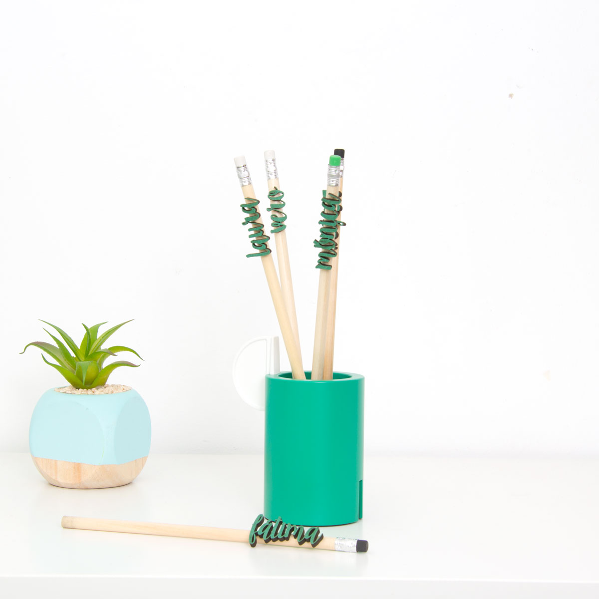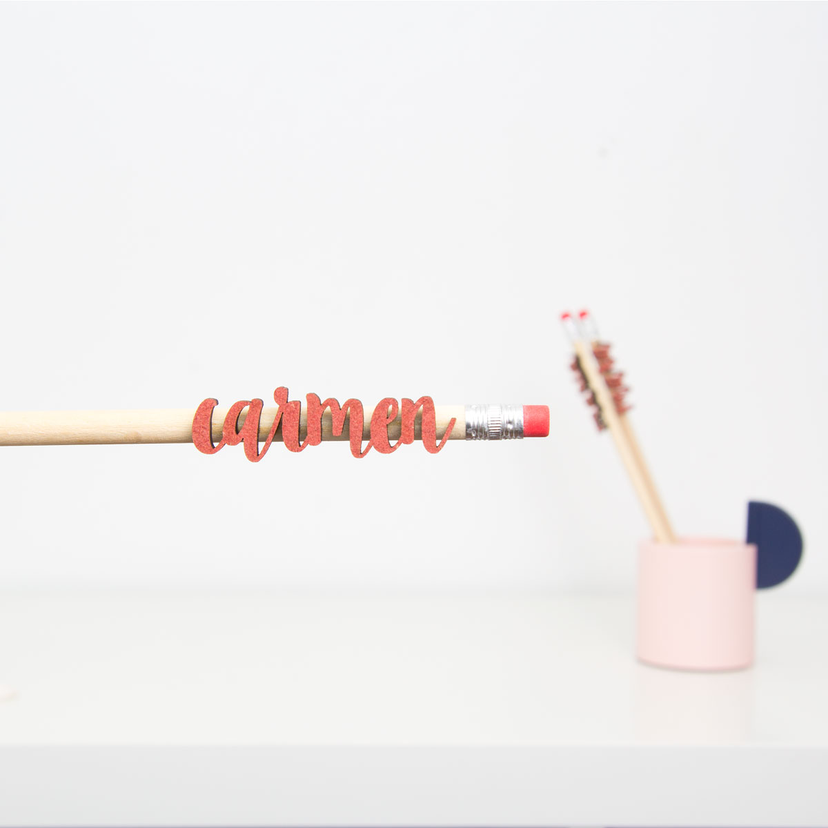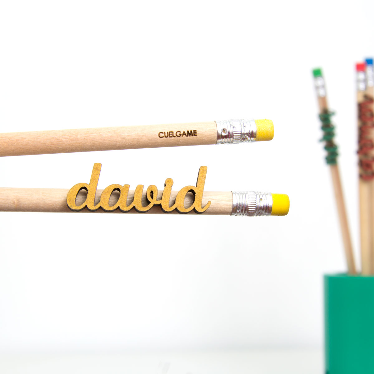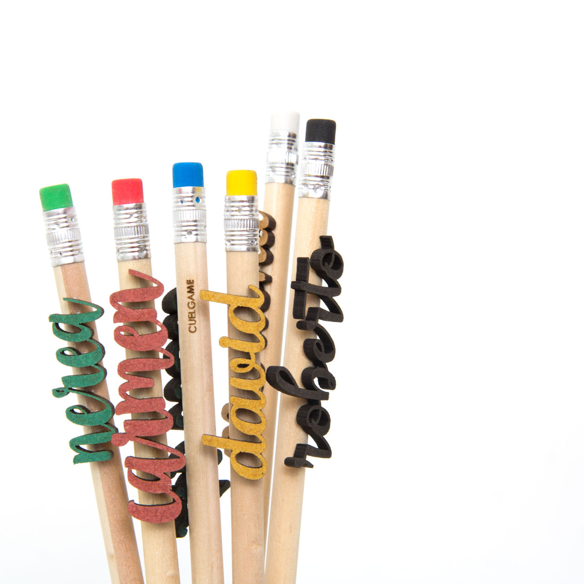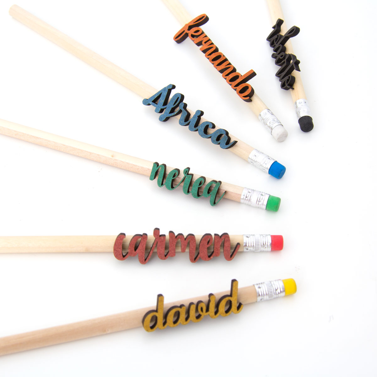 Material: lápiz de madera de grafito con gomas de colores. Nombres de madera DM de espesor 3 mm.