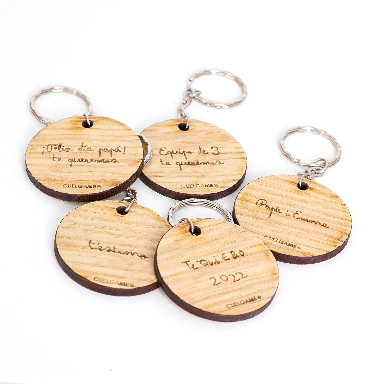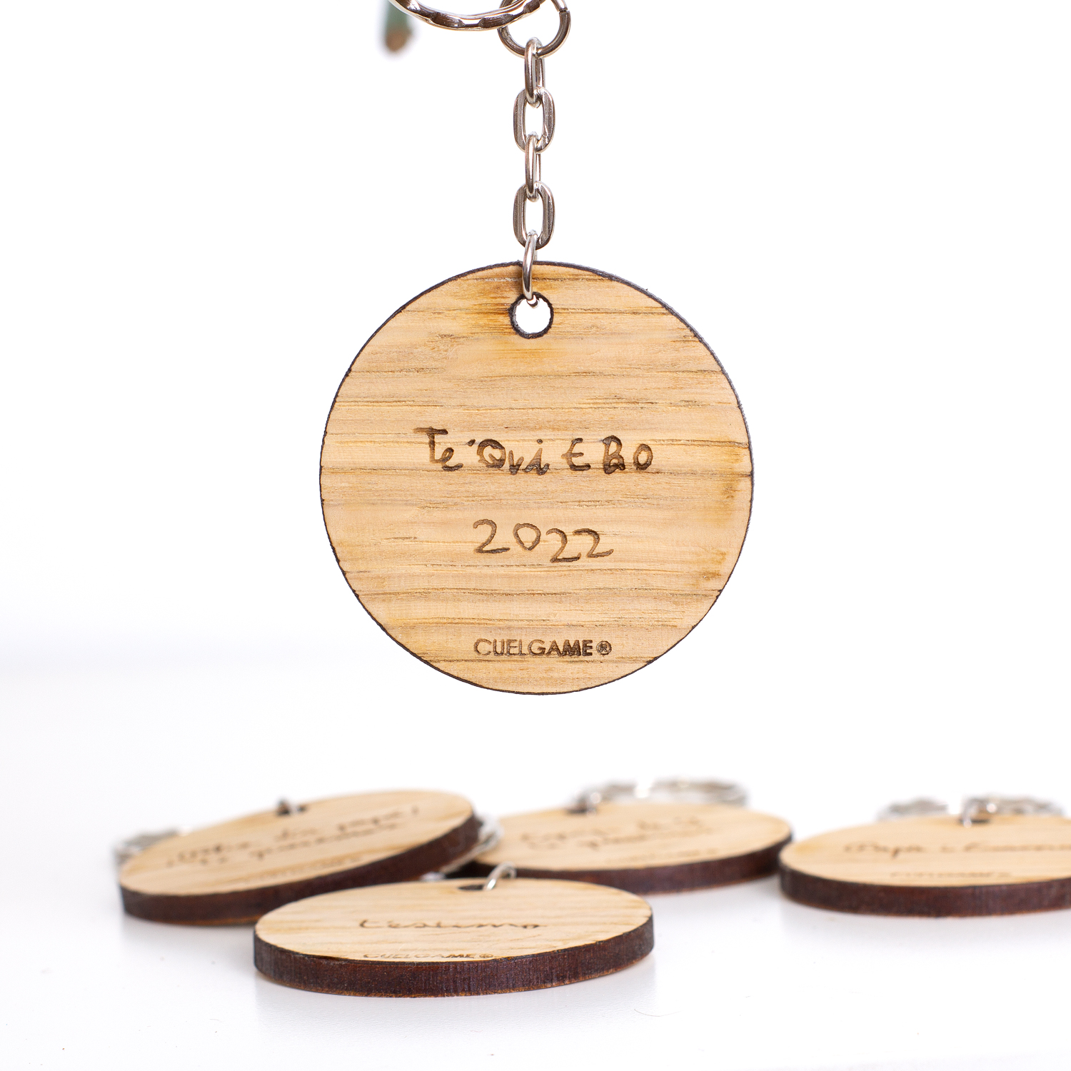 Material: madera de espesor 3 mm. Anilla de llavero metálica.
