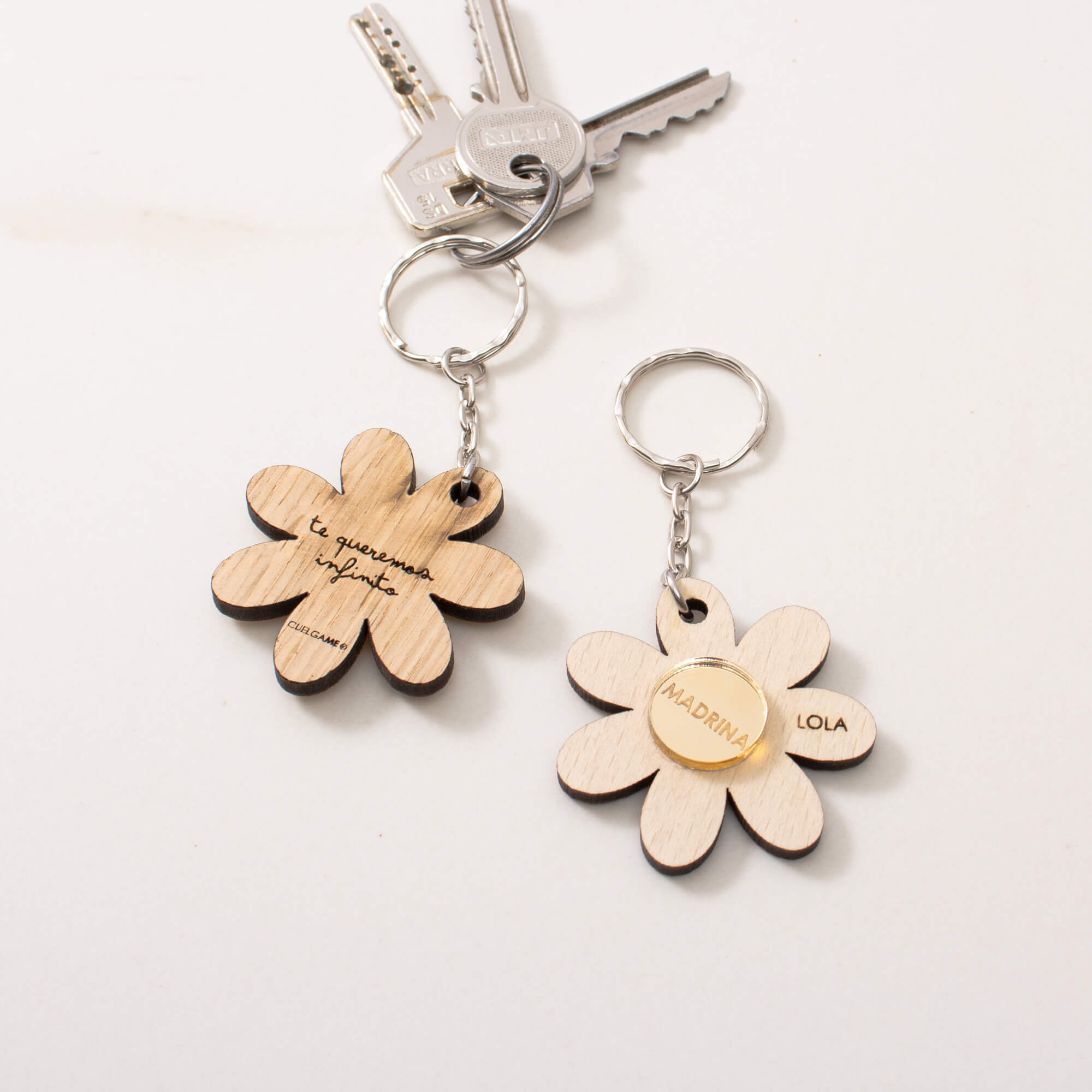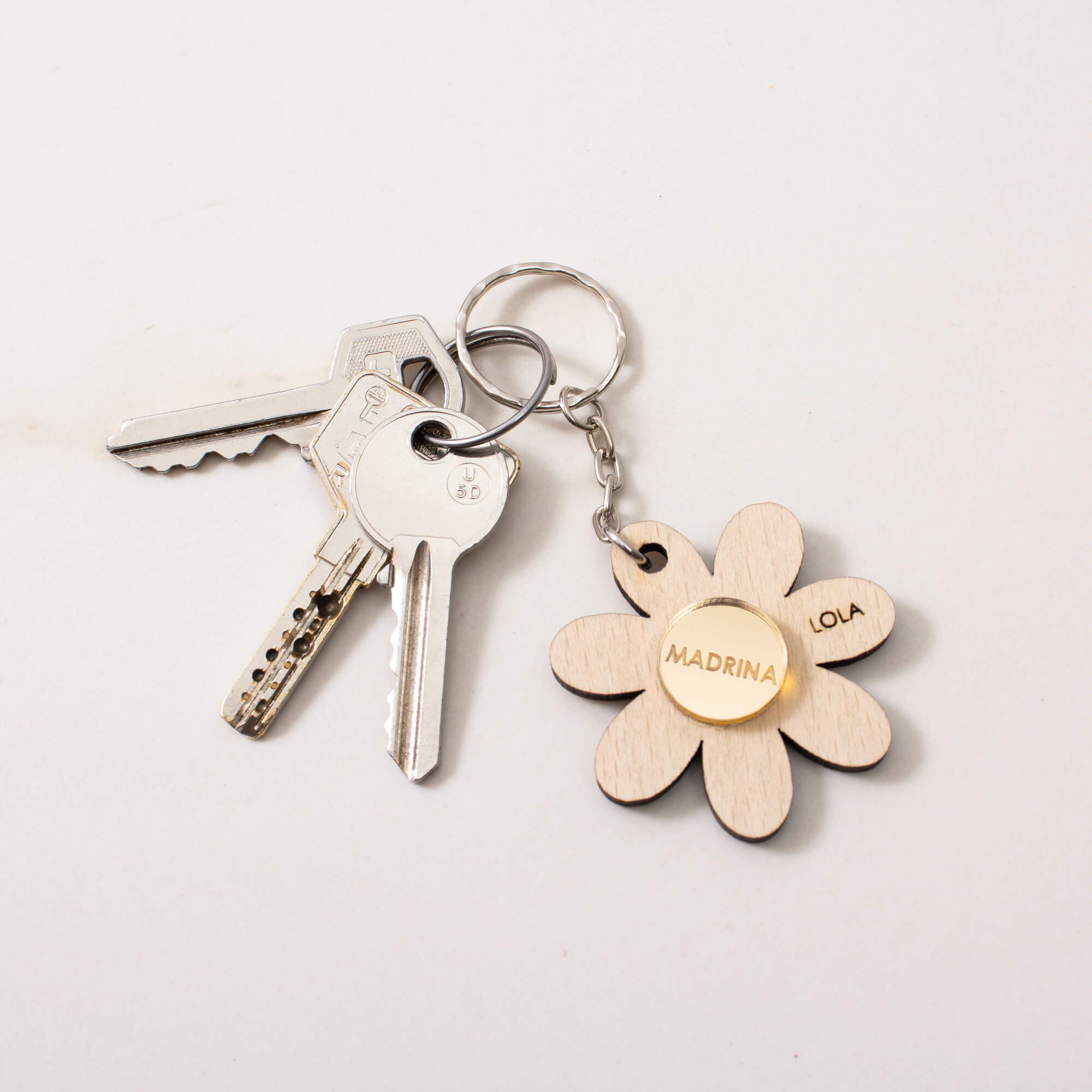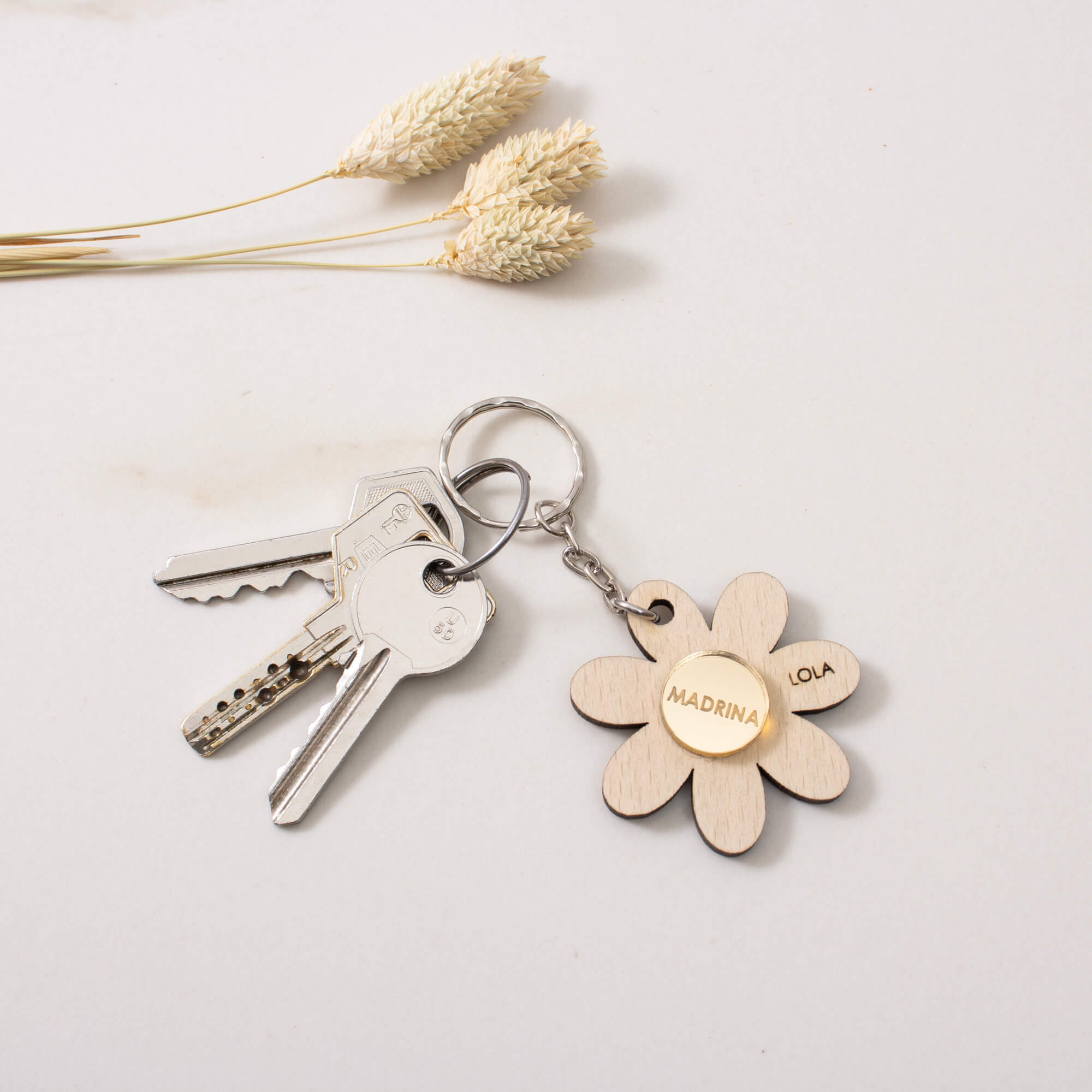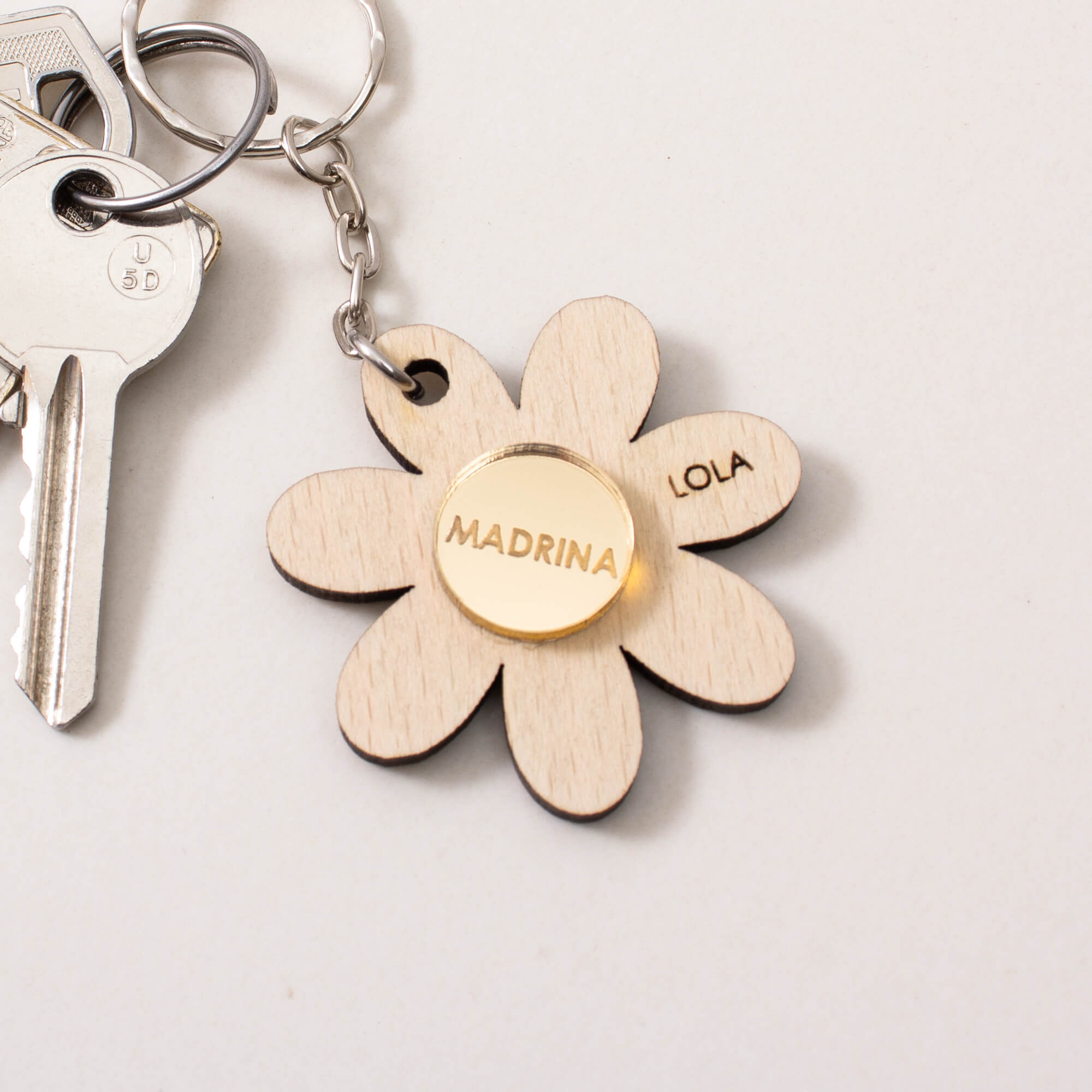 Un llavero de madera con forma de flor personalizado como este.