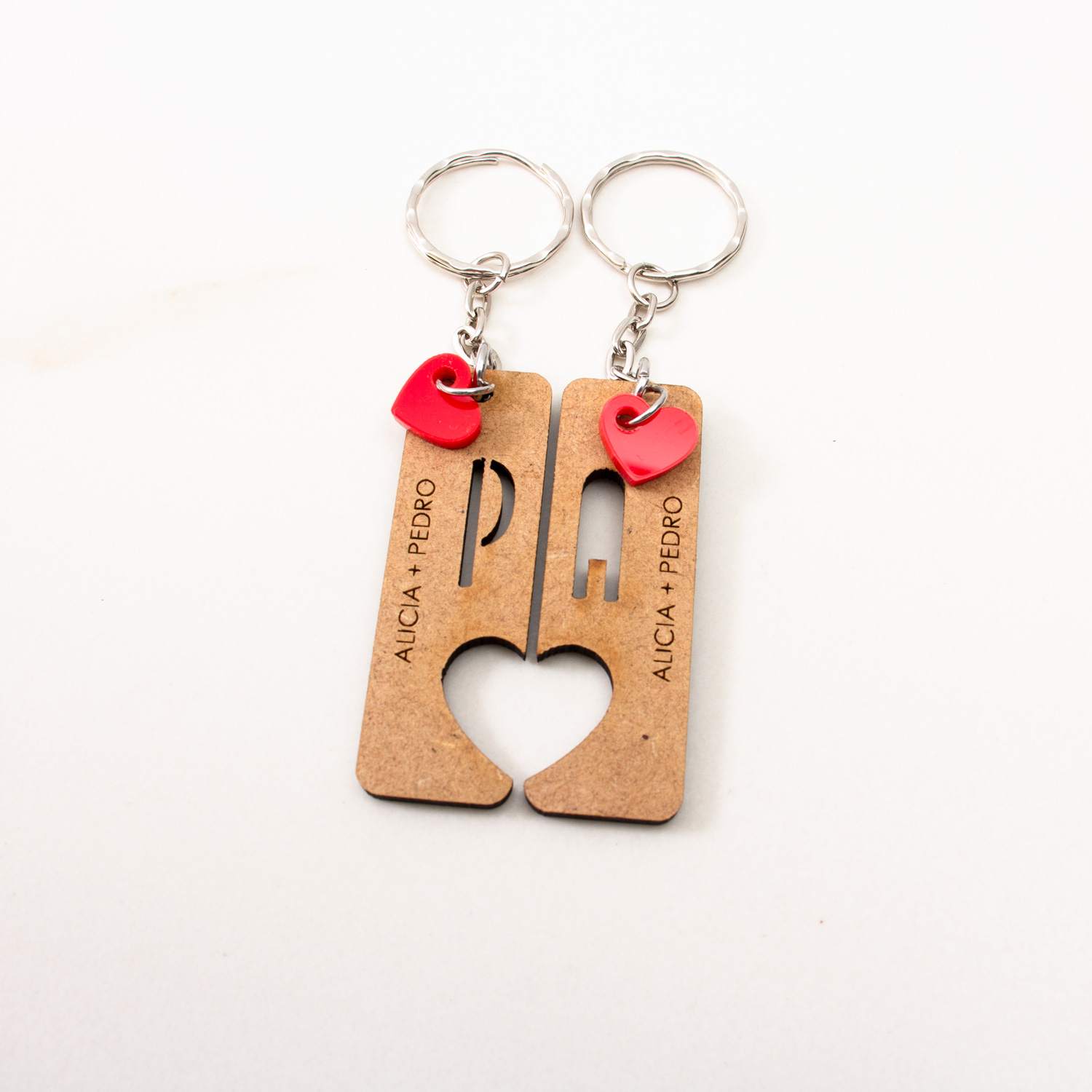 Incluye: dos llaveros personalizados de madera, con anillas y mini corazones de metacrilato rojo.