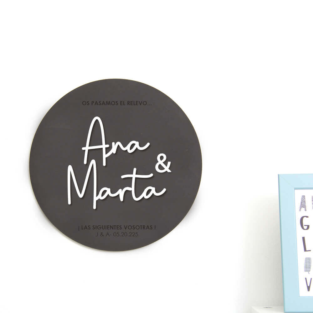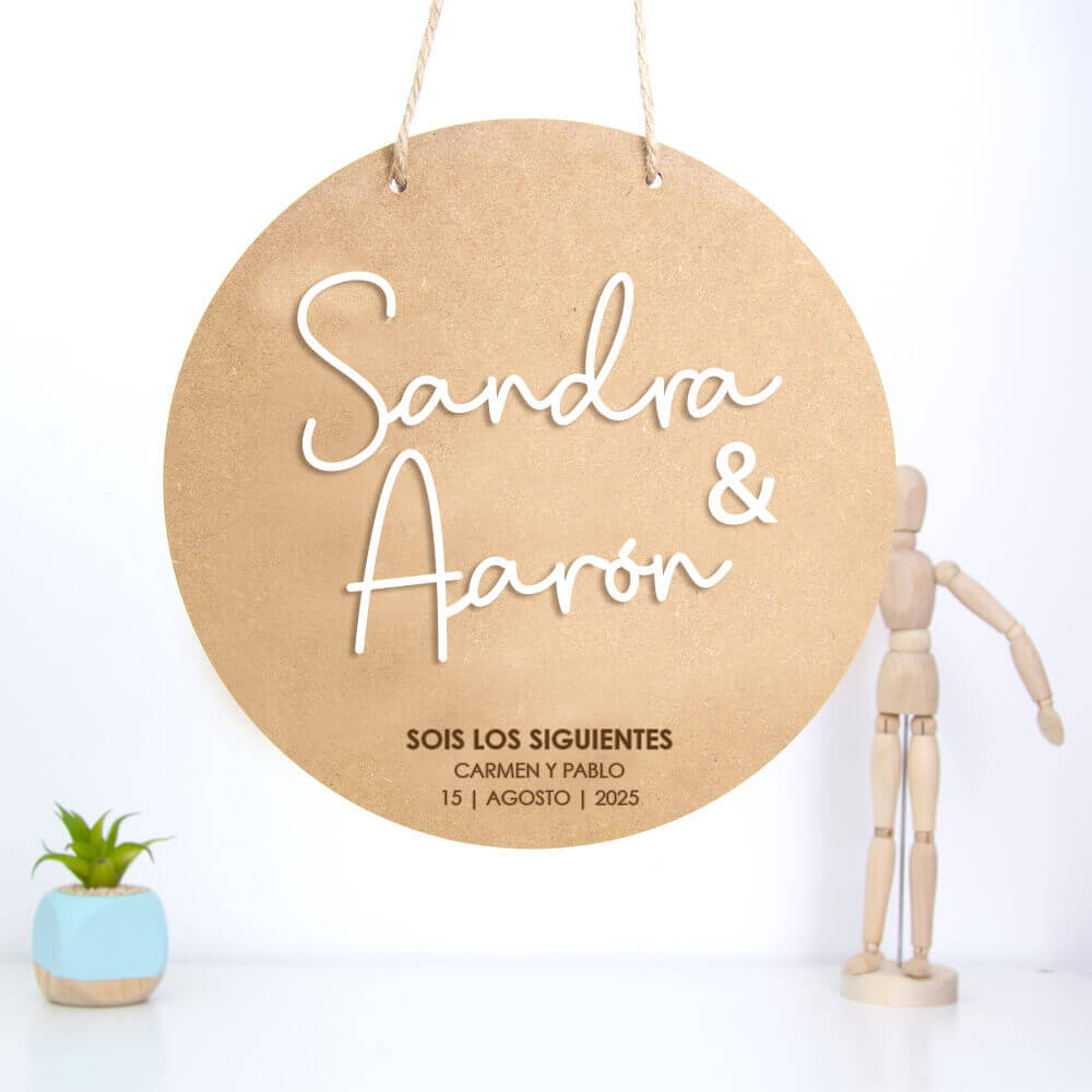 Una bonita placa de madera para colgar o pegar, con los nombres de «los siguientes» de tu boda.