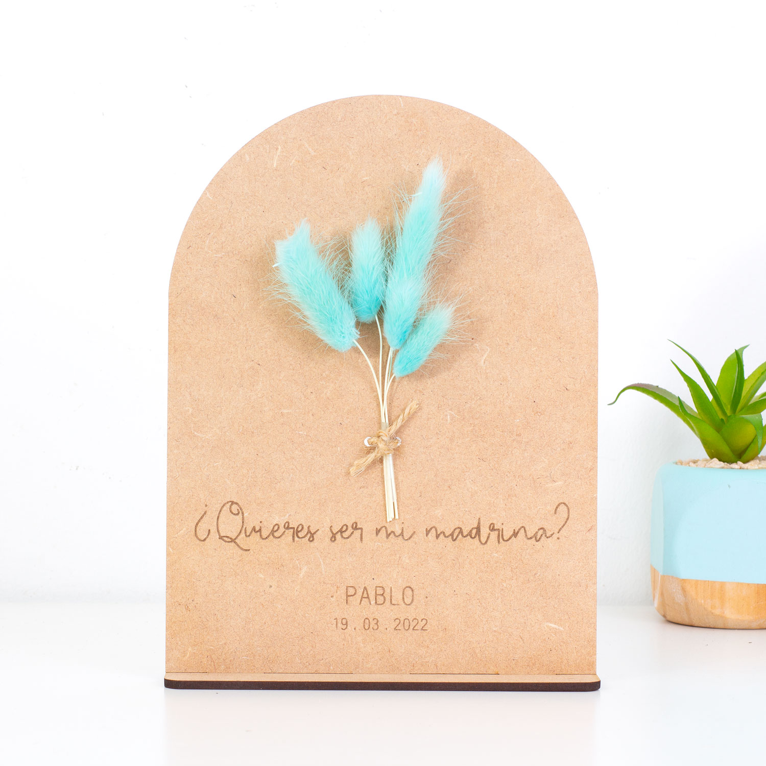 Por ejemplo esta placa floral en madera en la que puedes grabar una frase de agradecimiento.