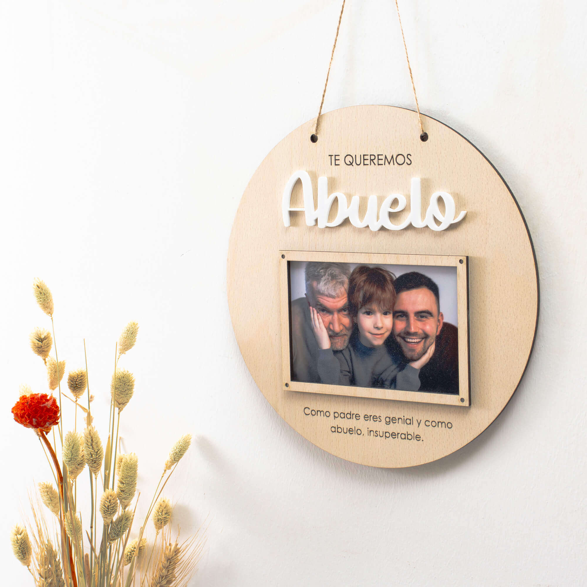Colocación: puedes pedirla con agujeros y cuerda, para poder colgarla, o sin agujeros, con un soporte para colocarla apoyada sobre cualquier superficie.