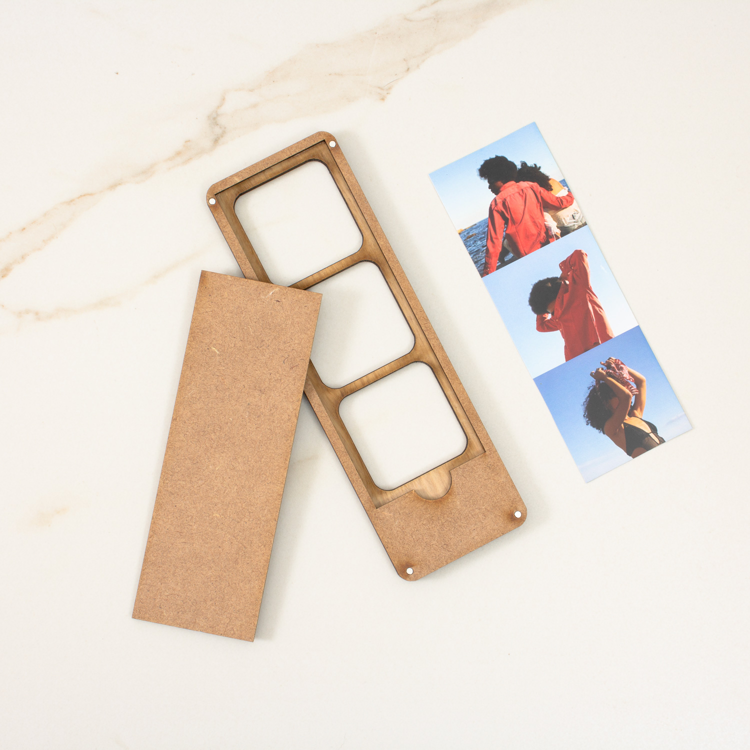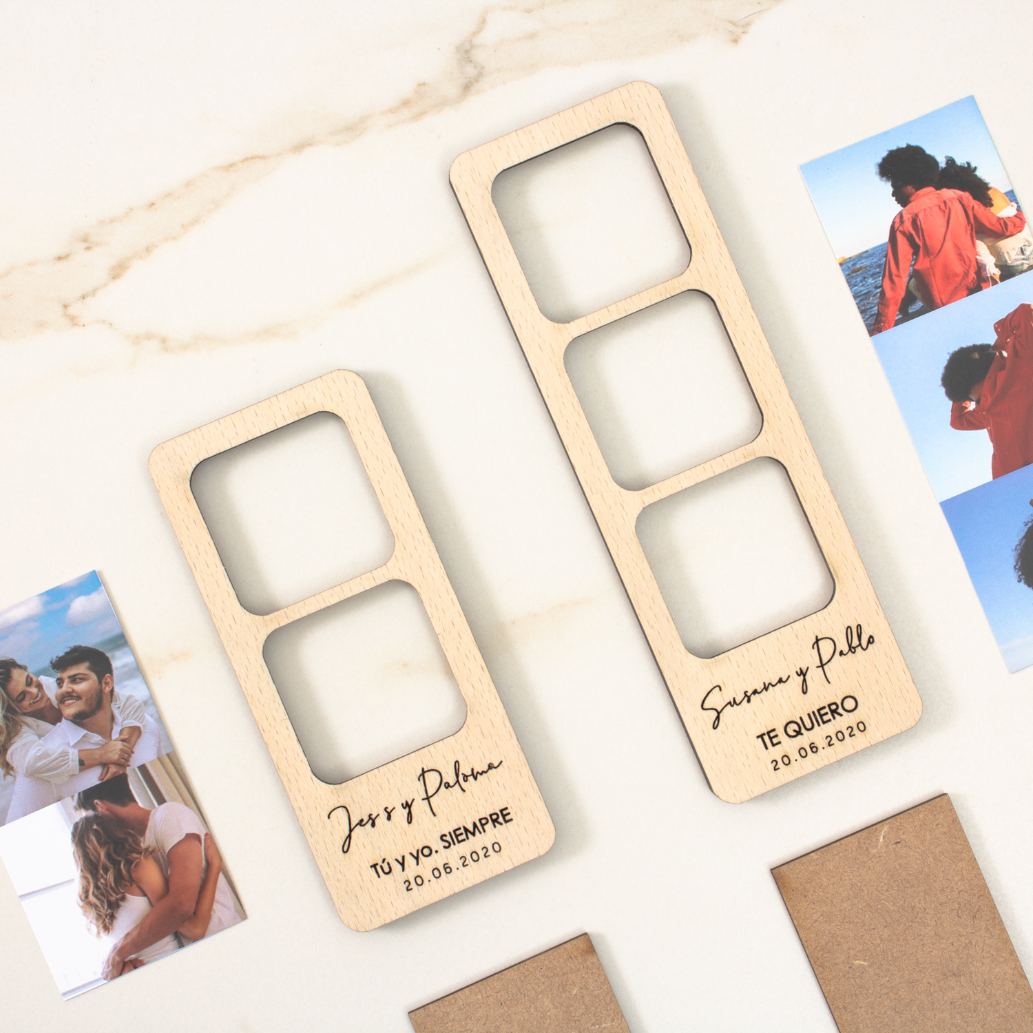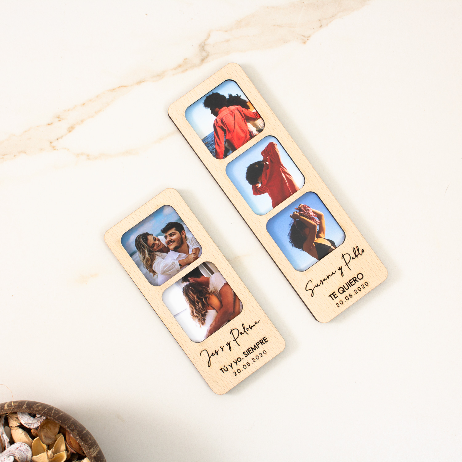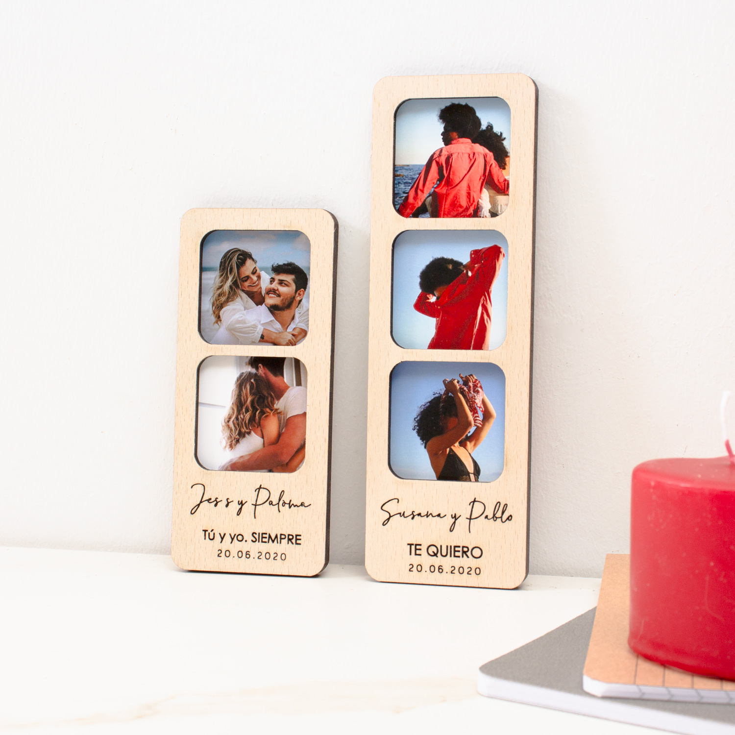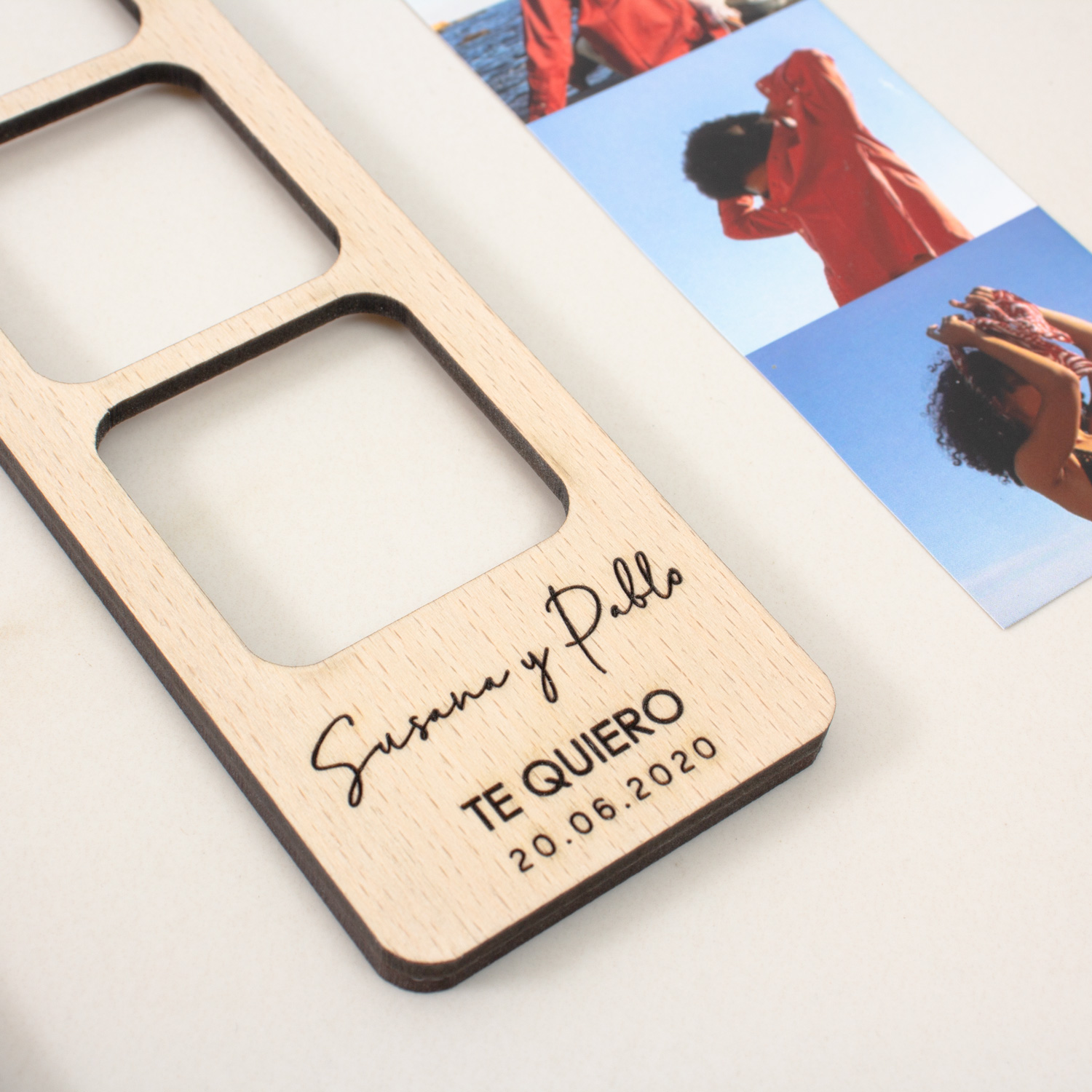 La típica tira de fotomatón pero en elegante madera y personalizada con tus nombres y texto.